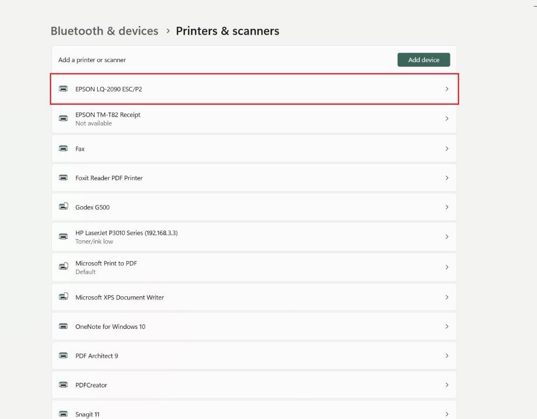 5. กลับไปที่หน้า Printers & Scanners คลิกเลือกเครื่องพิมพ์ที่ต้องการตั้งค่า จากตัวอย่างคือ เครื่องพิมพ์ EPSON LQ-2090 ESC/P2