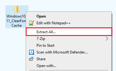 2. กดคลิกขวาที่ไฟล์ Windows10_11_ClearFontCache ที่ดาวน์โหลด แล้วเลือก Extract All เพื่อแตกไฟล์ .zip จะได้โฟลเดอร์ชื่อ Windows10_11_ClearFontCache