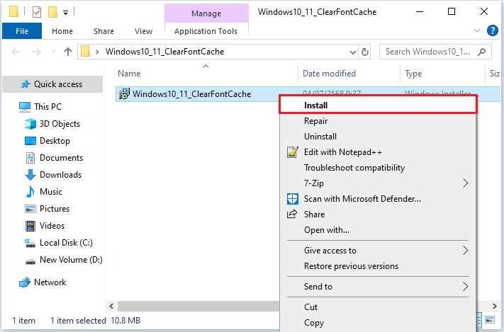 3. ดับเบิ้ลคลิกโฟลเดอร์ดังกล่าว จะพบไฟล์ Windows10_11_ClearFontCache.msi จากนั้นทำการติดตั้ง โดยคลิกขวาแล้วกดเลือก Install ดังภาพ