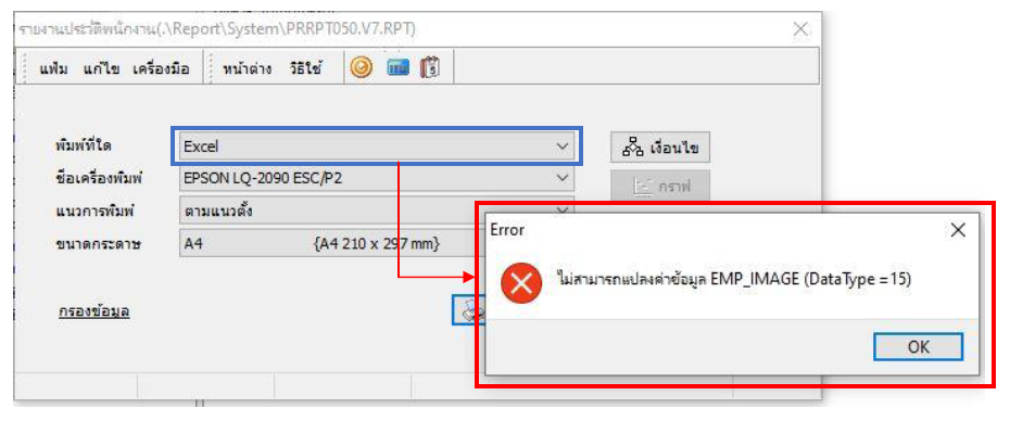 คำอธิบาย: ข้อผิดพลาดดังกล่าวเกิดจากการส่งออกรายงานประวัติพนักงาน (PRRPT050.V7.RPT) ไปเป็นแฟ้ม Excel