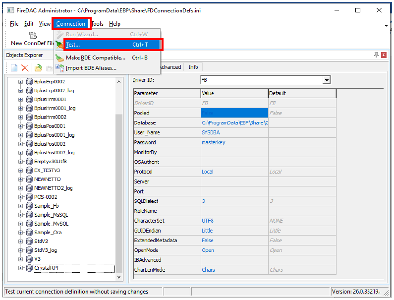 5. คลิกเลือกไฟล์เชื่อมโยง CrystalRPT แล้วกดเลือกเมนู Connection แล้วเลือก Test