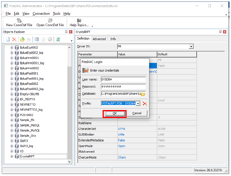 3.4 กำหนดค่า Username เป็น “SYSDBA” และ Password เป็น “masterkey”