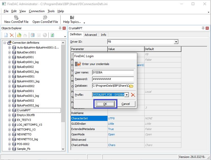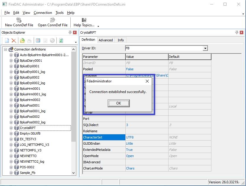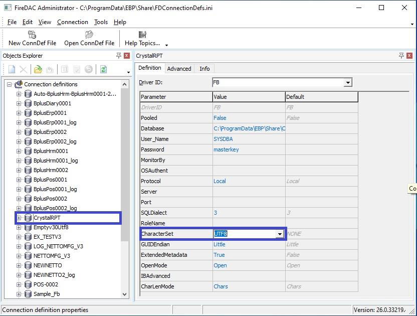 1. ตรวจสอบโปรแกรมตั้งค่าเชื่อมโยงฐานข้อมูล(FiredacAdmin) เลือก CrystalRPT แล้วกำหนดค่า CharacterSet ให้เป็น “UTF8”