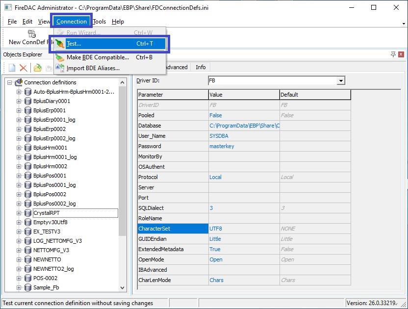3. คลิกเมนู Connection แล้วคลิก Test เพื่อทดสอบการเชื่อมโยงข้อมูลว่าเชื่อมโยงได้หรือไม่