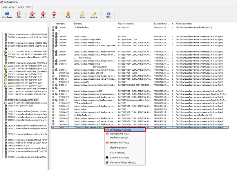 - หน้าทะเบียนรายงาน > เลือกเมนูรายงาน > คลิ๊กที่รายงานที่ต้องการแก้ไข > คลิ๊กขวาเลือก “แก้ไขทะเบียนรายงาน” จะปรากฏหน้าจอแฟ้มทะเบียนรายงาน