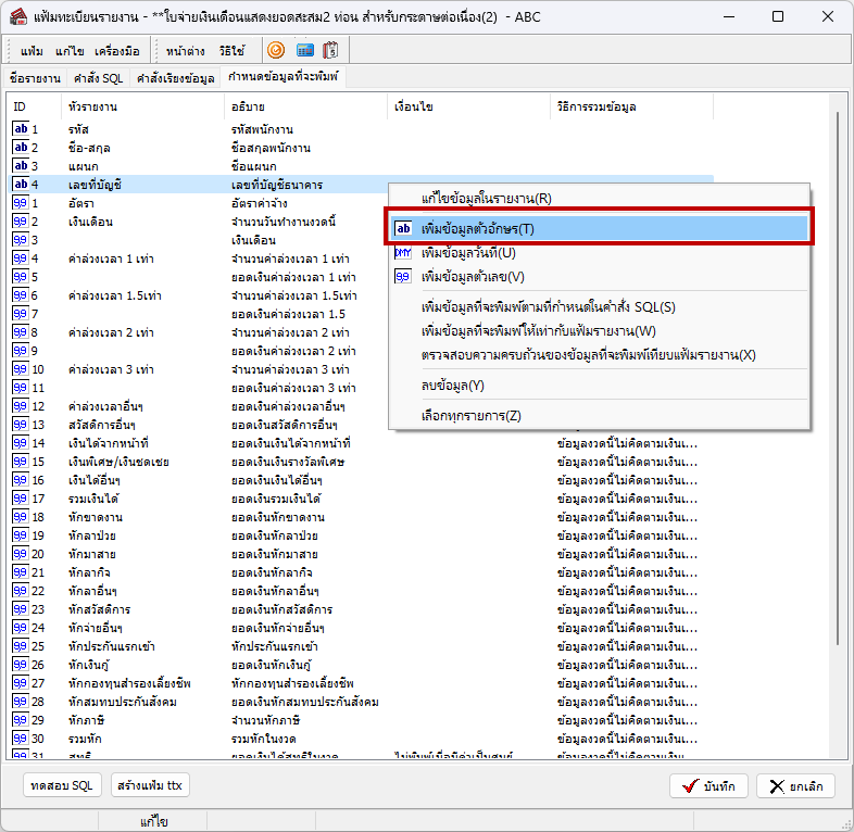 - หน้าแฟ้มทะเบียนรายงาน > เลือกแถบเมนู “กำหนดข้อมูลที่จะพิมพ์” > คลิ๊กขวาที่หน้าจอเลือก “เพิ่มข้อมูลตัวอักษร”