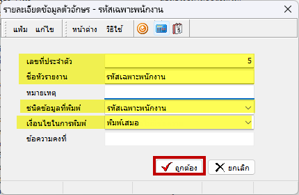 - หน้ารายละเอียดข้อมูลตัวอักษร ทำการระบุเลขที่ประจำตัว, ชื่อหัวรายงาน, ชนิดข้อมูลที่พิมพ์ ตามตัวอย่างดังรูป > เลือก “ถูกต้อง” เพื่อทำการบันทึกข้อมูลรายละเอียดตัวอักษร