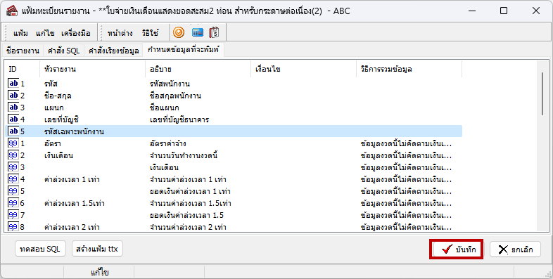 - ทำการกดปุ่ม บันทึก เพื่อทำการบันทึกข้อมูล และลองทำการเรียกพิมพ์รายงานใหม่อีกครั้ง