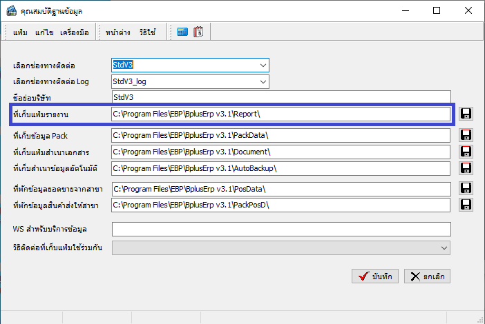 3. หน้าจอคุณสมบัติฐานข้อมูล ให้กำหนดที่เก็บแฟ้มรายงาน ให้ตรงกับตำแหน่งที่สำเนารายงานมาเก็บไว้