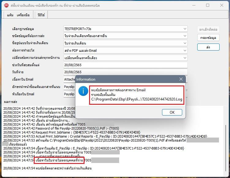 อธิบาย: กดส่ง E-Payslip แล้วโปรแกรมแจ้งข้อผิดพลาด “เนื้อหาในใบจ่ายไม่ตรงบุคคลที่จ่าย” และไม่สามารถส่ง E-Payslip ได้