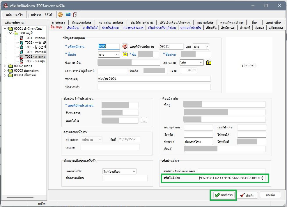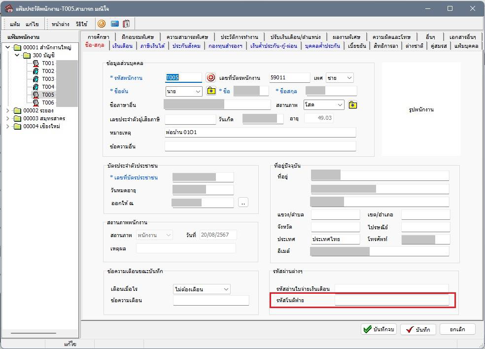 1. ไปยังหน้าแฟ้มประวัติพนักงานที่พบปัญหา จะพบว่าช่องรหัสโนติฟายไม่มีข้อมูล ดังภาพ