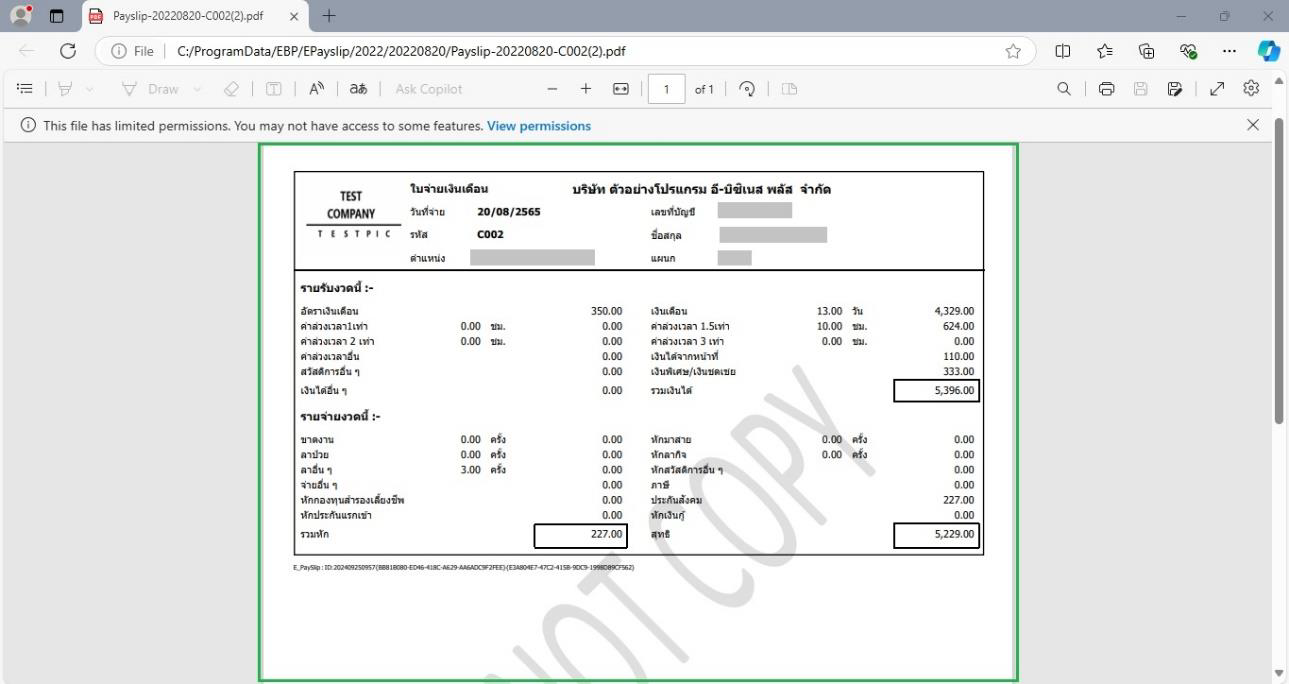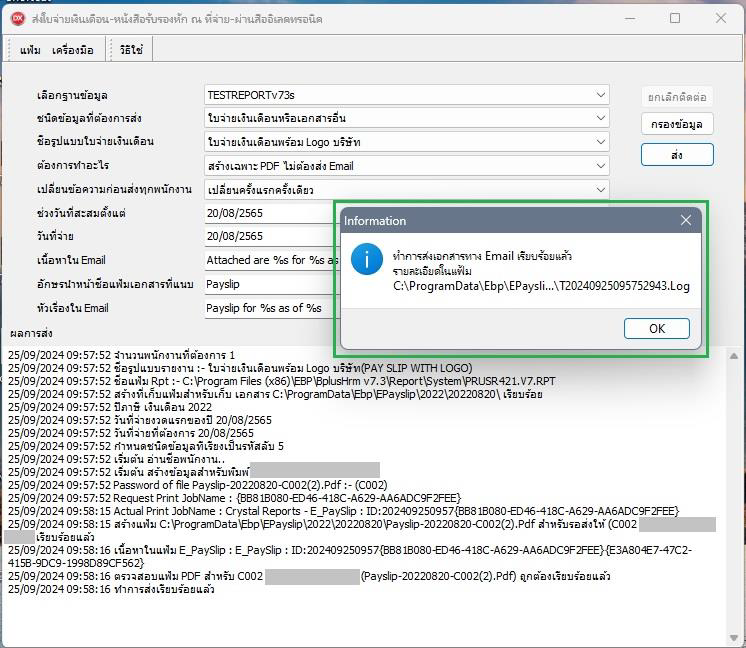 9. จากตัวอย่าง สามารถกดส่ง E-payslip ได้เรียบร้อย และใบจ่ายเงินเดือนแสดงภาพโลโก้