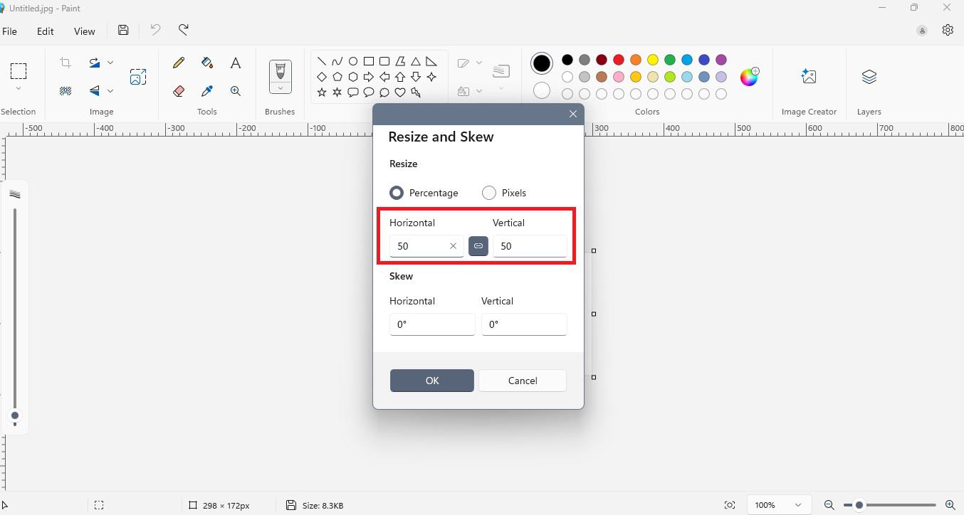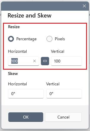 4. โปรแกรมแสดงหน้าต่าง Resize & skew ในส่วน Resize มีรูปแบบอัตราส่วนการลดขนาดไฟล์รูปภาพ 2 รูปแบบ คือ Percentage และ Pixels โดยวิธีที่แนะนำคือ