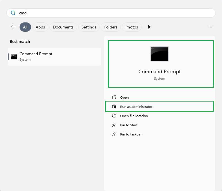 2. เมื่อค้นหาพบโปรแกรม Command Prompt แล้วให้กดเลือก “Run as administrator”