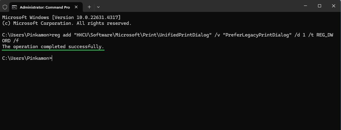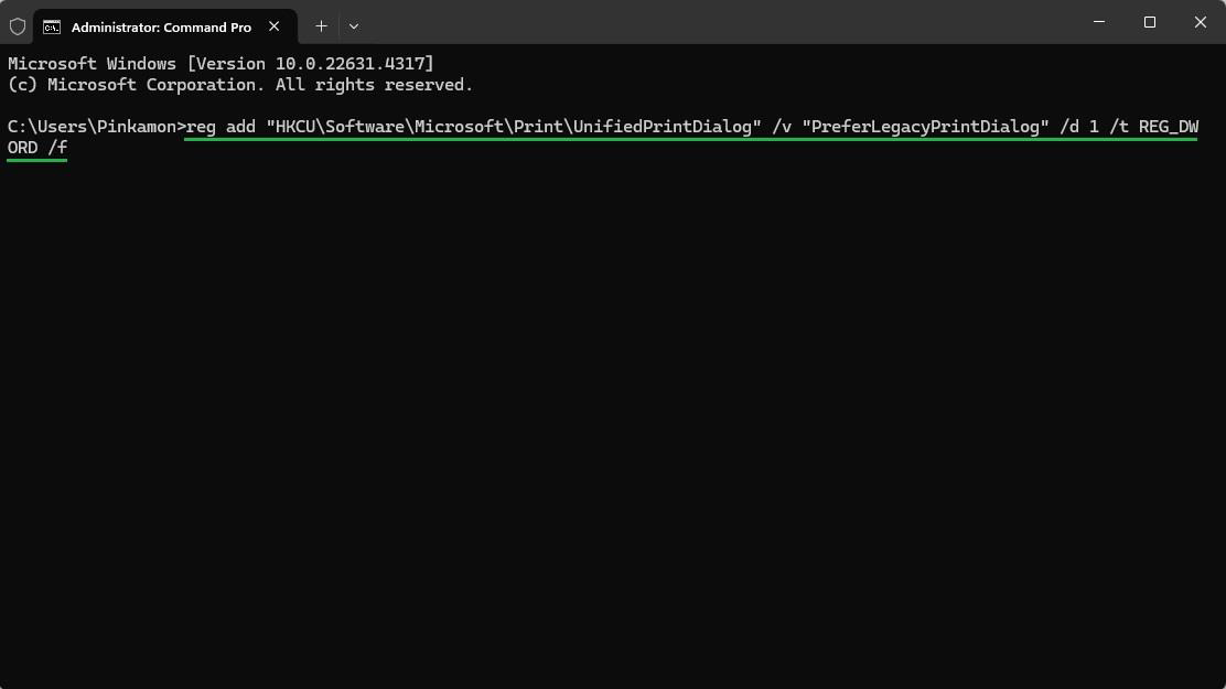 3. หน้าต่าง Command พิมพ์คำสั่ง “reg add "HKCU/Software/Microsoft/Print/UnifiedPrintDialog" /v "PreferLegacyPrintDialog" /d 1 /t REG_DWORD /f”