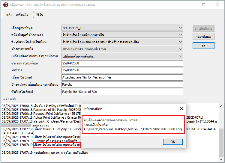 อธิบาย: ส่ง E-Payslip โดยการกรองพนักงานแล้วแสดง Error ดังภาพ