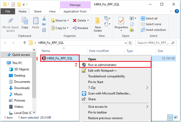 3. ดับเบิ้ลคลิกโฟลเดอร์ดังกล่าว จะพบไฟล์ HRM_Fix_RPF_SQL.exe จากนั้นทำการติดตั้ง โดยคลิกขวาแล้วกดเลือก Run as administrator ดังภาพ