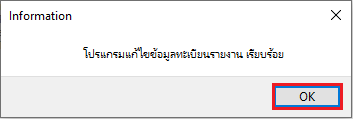 6. ระบบจะแสดงหน้าต่างแจ้งเตือน “โปรแกรมแก้ไขข้อมูลทะเบียนรายงาน เรียบร้อย” คลิกปุ่ม “OK”