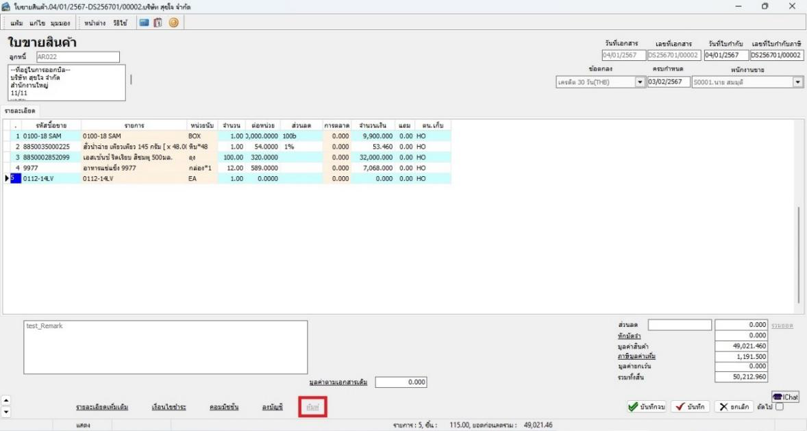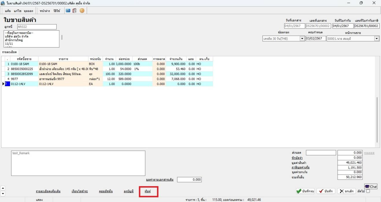 6. จากนั้นไปยังหน้าต่างใบขายสินค้า ปุ่ม “พิมพ์” สามารถกดใช้งานได้เรียบร้อยแล้ว