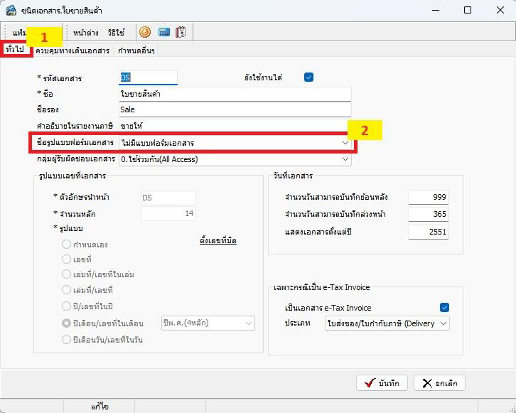 3. ระบบแสดงหน้าต่างชนิดเอกสาร.ใบขายสินค้า เลือกแถบ “ทั่วไป” ตรวจสอบช่องชื่อรูปแบบฟอร์มเอกสาร กรณีไม่มีการกำหนดฟอร์มเอกสาร ระบบจะแสดงค่าเป็น “ไม่มีแบบฟอร์มเอกสาร” ดังภาพตัวอย่าง