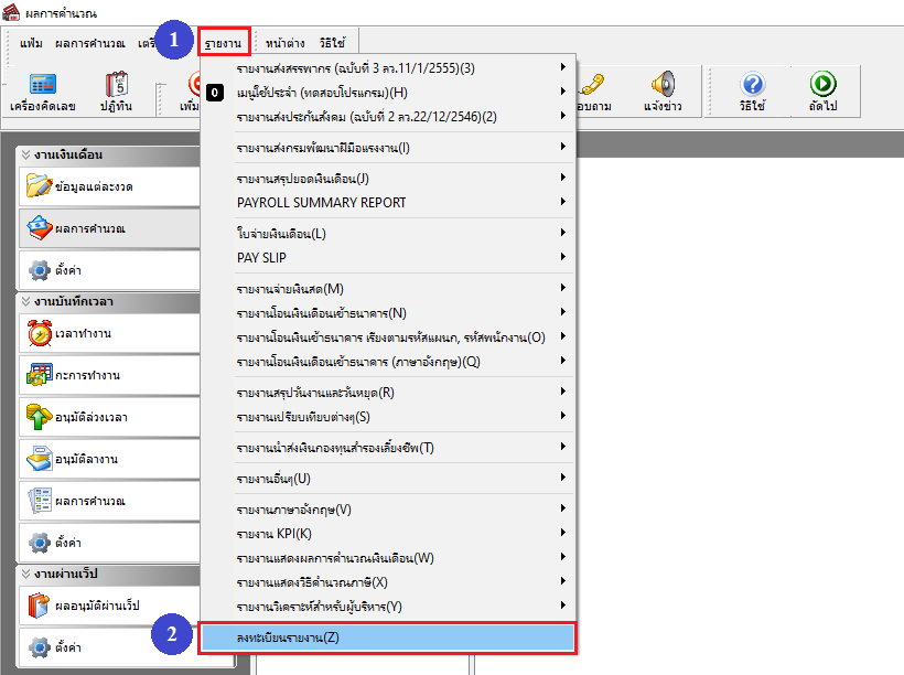 - ไปที่เมนู รายงาน > เลือกเมนู “ลงทะเบียนรายงาน”