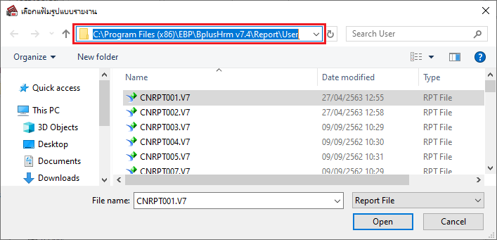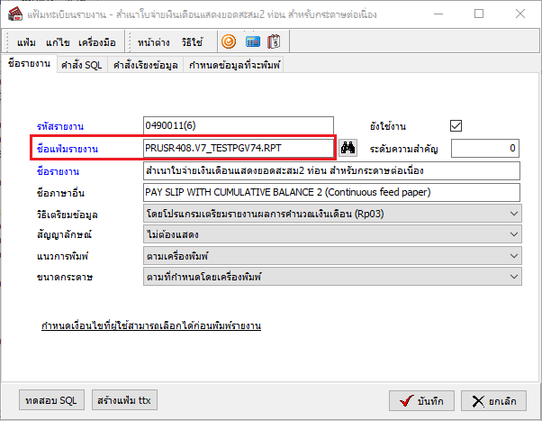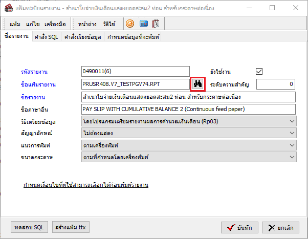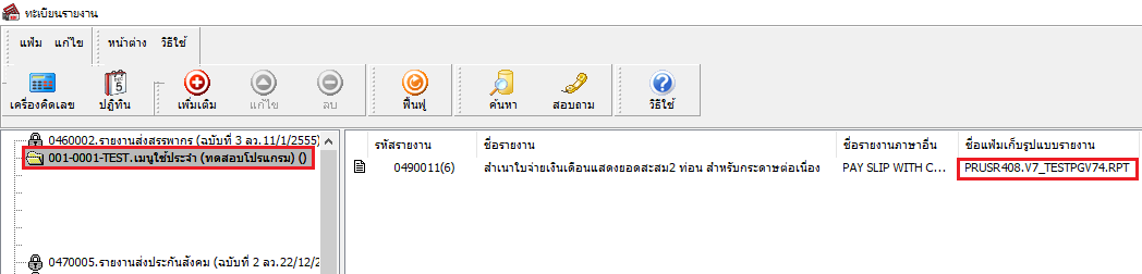 - ไปที่เมนูรายงานที่เรียกใช้ ตรวจสอบไฟล์รายงาน .RPT ได้จากช่อง “ชื่อแฟ้มเก็บรูปแบบรายงาน”