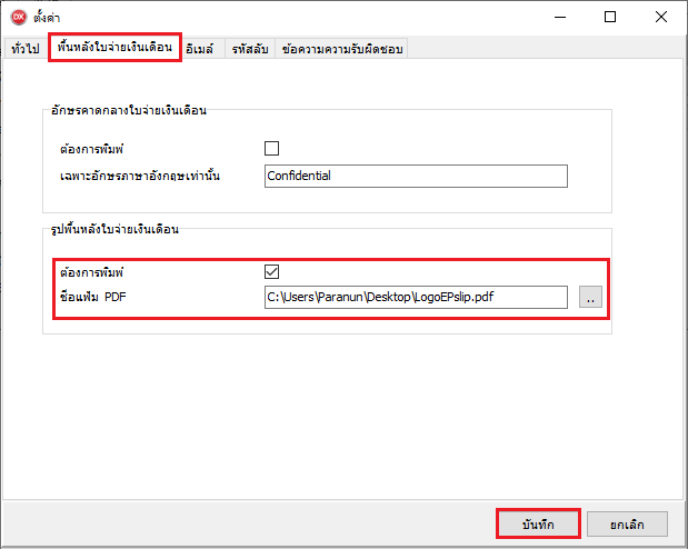 6. ระบบจะแสดงหน้าต่าง “ตั้งค่า” คลิกแถบ “พื้นหลังใบจ่ายเงินเดือน” ทำการเลือกข้อมูล ส่วนของ รูปพื้นหลังใบจ่ายเงินเดือน ดังนี้