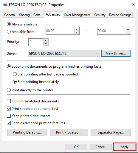 10. ตรวจสอบ Driver Printer ที่เลือกและคลิกปุ่ม “Apply”