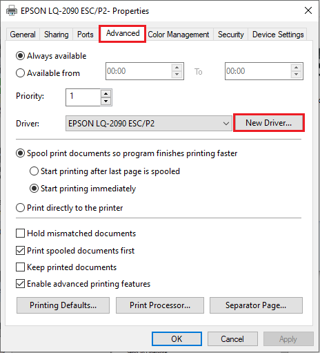 2. ระบบจะแสดงหน้า Properties จากนั้นไปที่แถบ Advance และคลิกปุ่ม “New Driver”