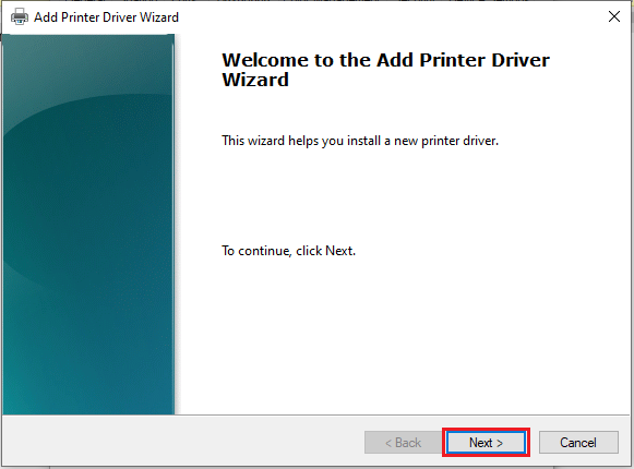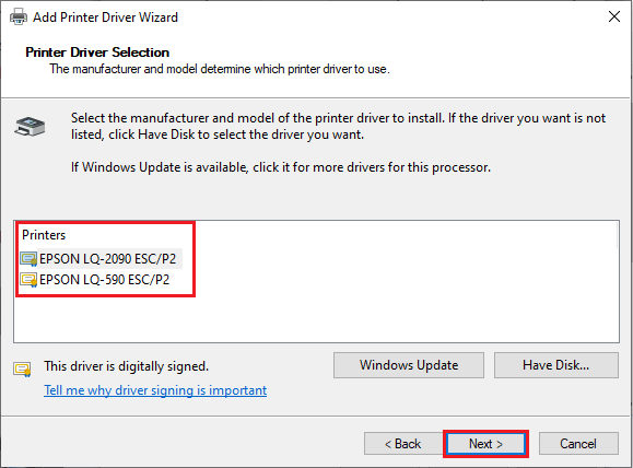 8. เลือกรุ่น Printer และคลิกปุ่ม “Next >”
