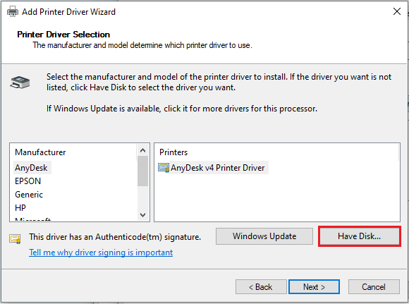 4. ระบบจะเข้าสู่หน้า “Printer Driver Selection” ทำการคลิกปุ่ม “Have Disk…”