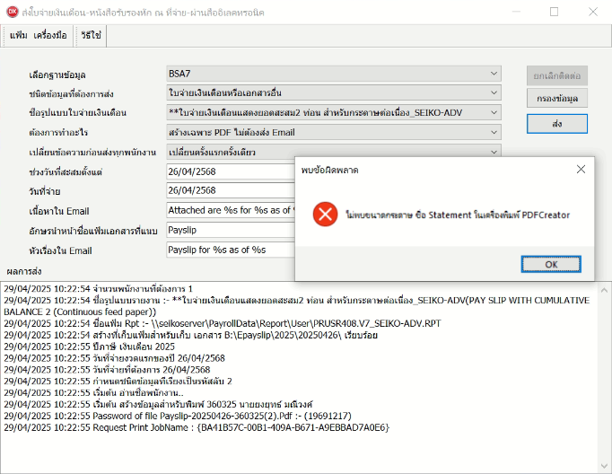 อธิบาย: ส่ง E-Payslip ใบจ่ายเงินเดือน แล้วแจ้งข้อผิดพลาดดังกล่าว ส่งผลให้ไม่สามารถสร้างไฟล์ PDF หรือส่งอีเมลได้