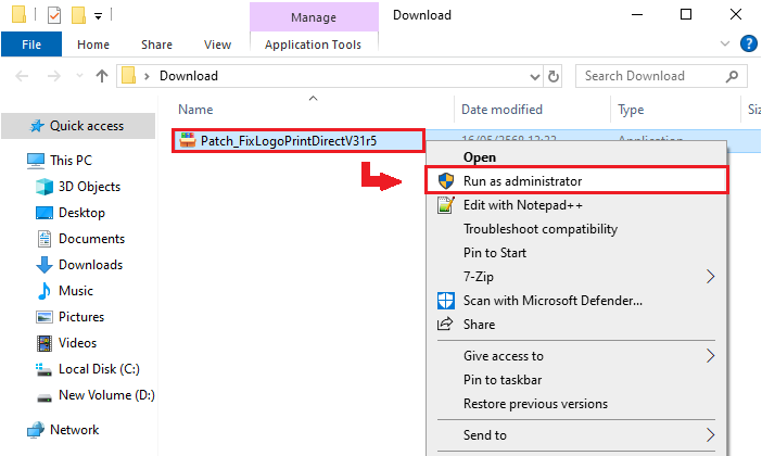 3. ทำการติดตั้งไฟล์ “Patch_FixLogoPrintDirectV31r5.exe” โดยการคลิกขวากดเลือก “Run as administrator”