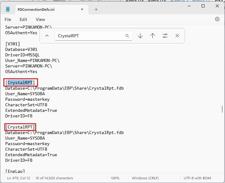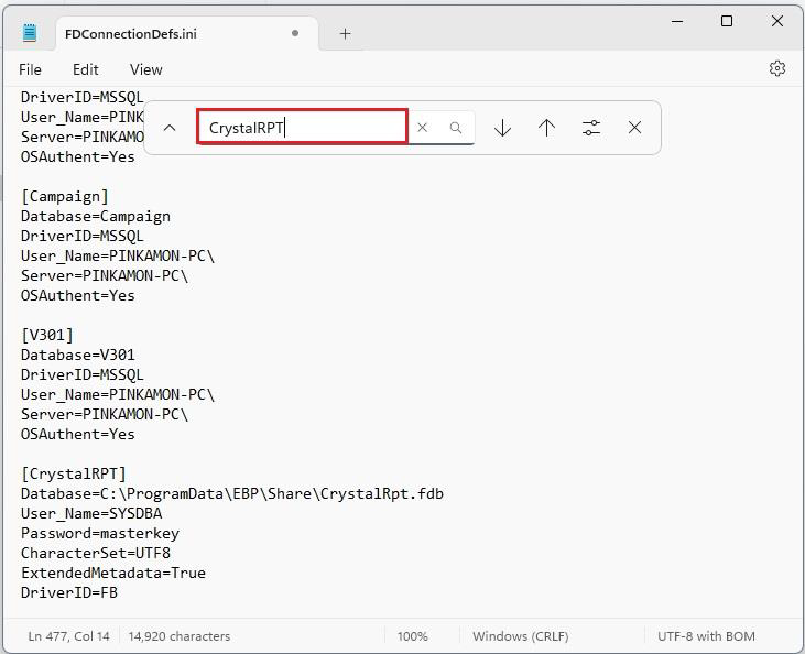 4. เปิดไฟล์ FDConnectionDefs.ini บนโปรแกรม Notepad แล้ว ให้กดปุ่ม “Ctrl+F” บนแป้นพิมพ์ เพื่อแสดงหน้าต่างค้นหา จากนั้นพิมพ์คำว่า “CrystalRpt” แล้วกดปุ่มแว่นขยาย เพื่อค้นหา