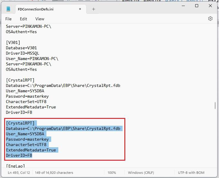 สาเหตุ: เกิดจากมีการกำหนดชื่อฐานข้อมูล CrystalRpt ซ้ำในไฟล์ FDConnectionDefs.ini