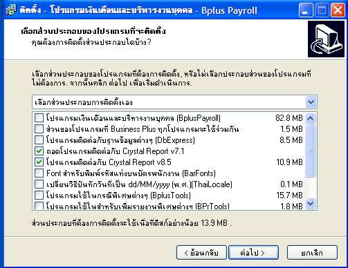 4. ทำตามขั้นตอนโดยคลิกปุ่ม ต่อไป> ไปเรื่อยๆ จนปรากฎหน้าจอดังรูปด้านล่างนี้ ให้ติ๊กเลือกส่วนประกอบของโปรแกรมที่จะติดตั้งเพียง 2 รายการ ดังรูป และคลิกปุ่ม ต่อไป>