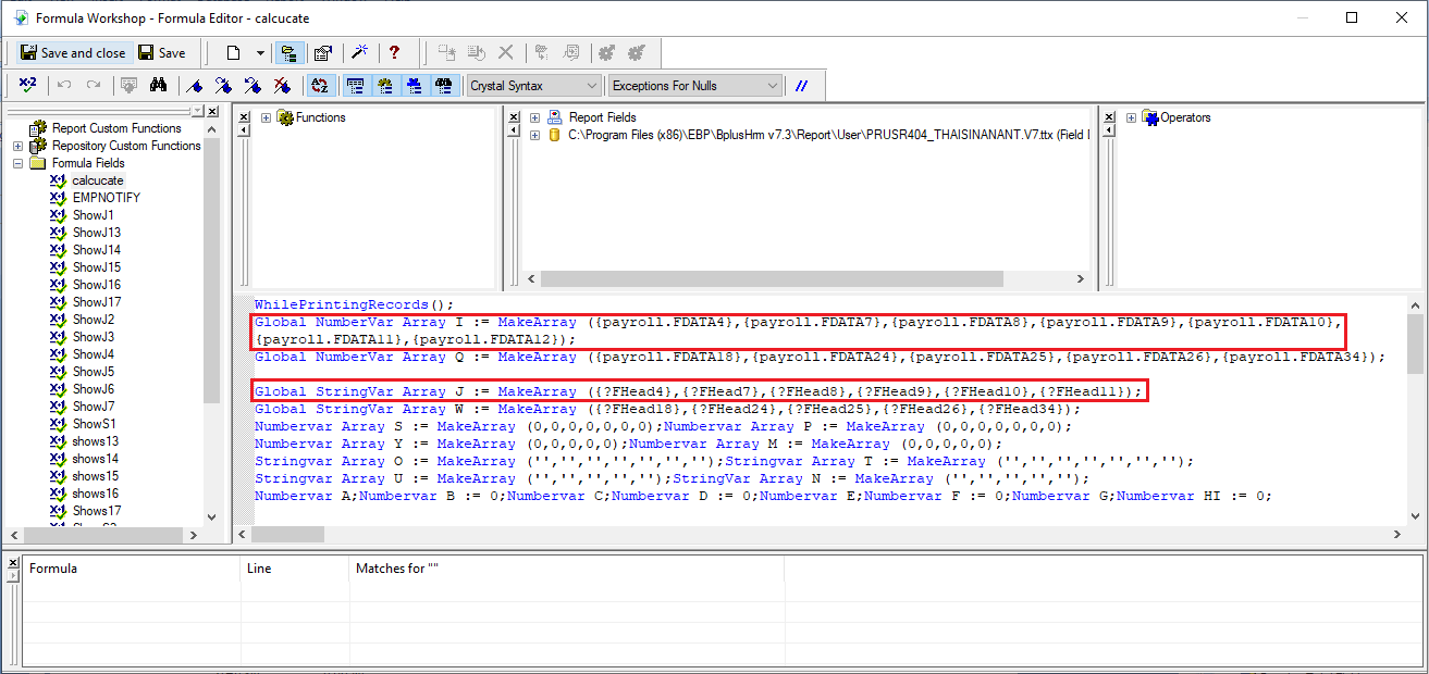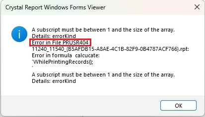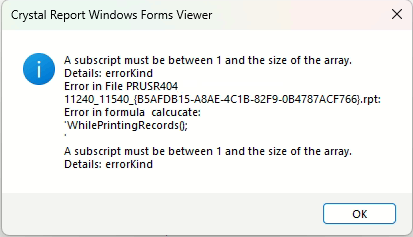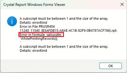 สาเหตุ: เกิดจากการกำหนดเงื่อนไข Formula ของไฟล์ .RPT ใส่ข้อมูลตัวแปร Array ไม่ครบ