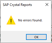 5. ระบบจะแสดงหน้าต่าง SAP Crystal Report แจ้ง “No errors found” (ไม่พบข้อมูลที่ผิดปกติ) ทำการคลิกปุ่ม OK
