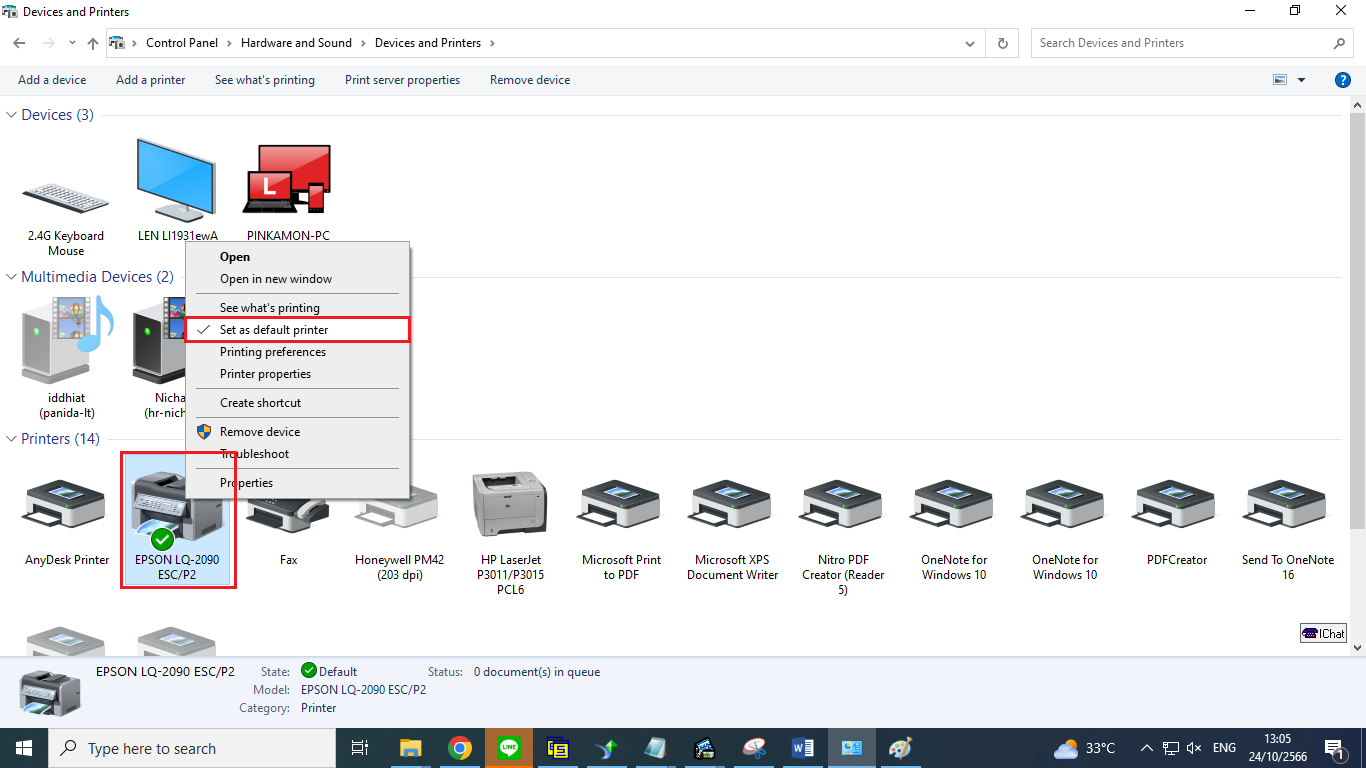 2. ตรวจสอบว่ามีการกำหนดเครื่องพิมพ์เริ่มต้นแล้วหรือไม่ โดยสังเกตที่สัญลักษณ์วงกลมเครื่องหมายถูกสีเขียว แสดงว่ามีการกำหนดเครื่องพิมพ์เริ่มต้นเรียบร้อยแล้ว หากไม่พบสัญลักษณ์ดังกล่าว สามารถทำการกำหนดค่าเครื่องพิมพ์เริ่มต้นได้โดยการคลิ๊กขวาที่เครื่องพิมพ์ จากนั้นเลือก “Set as default printer”
