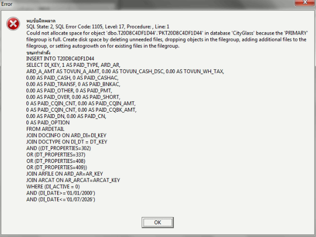 วิธีแก้ไข: ทำการสำรองข้อมูลแล้วย้ายตำแหน่งที่เก็บ หรือทำการลบพื้นที่ของ harddisk database เพื่อให้สามารถเพิ่มข้อมูลหรือสร้างไฟล์ได้ จากนั้นเปิดโปรแกรม และเรียกรายงานอีกครั้ง