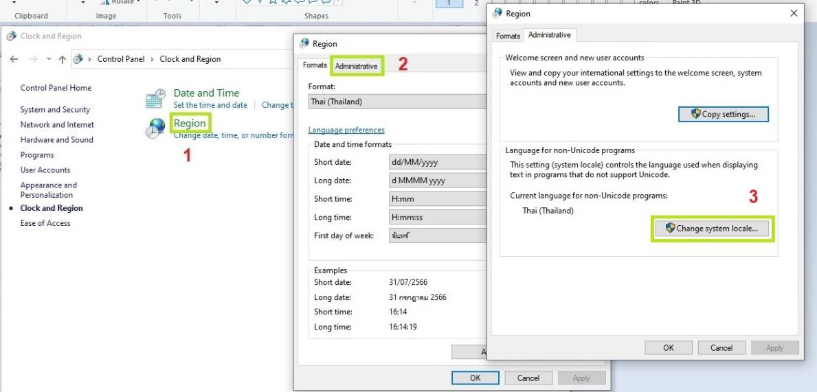 2. เลือก “Region” >> คลิกแถบ “Administrative” >> คลิกปุ่ม “Change system locale” ตามลำดับ