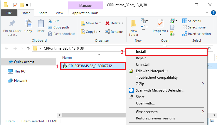 4. ดับเบิ้ลคลิกโฟลเดอร์ดังกล่าว จะพบไฟล์ CR13SP38MSI32_0-80007712.exe จากนั้นทำการติดตั้ง โดยคลิกขวาแล้วกดเลือก Install ดังภาพ เพื่อทำการติดตั้ง