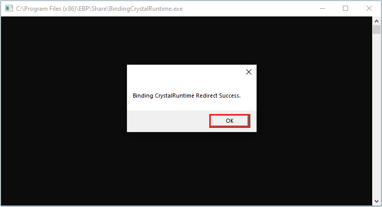 7. เมื่อดับเบิ้ลคลิกเพื่อรันไฟล์เรียบร้อยแล้ว โปรแกรมจะแสดงหน้าต่าง “Binding CrystalRuntime Redirect Success.” ทำการคลิกปุ่ม OK