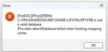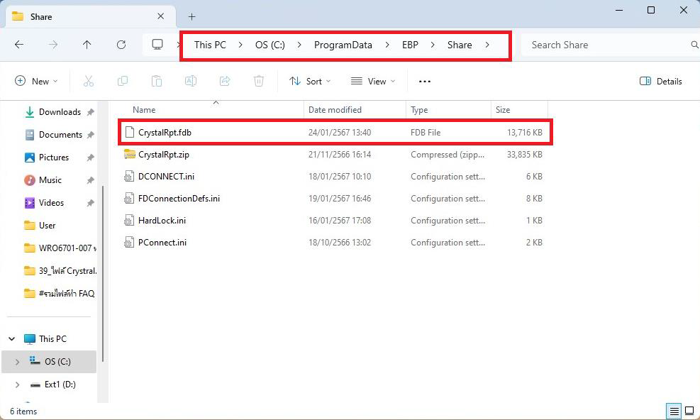 1. ตรวจสอบแฟ้ม CRYSTALRPT.FBD ใน C:/ProgramData/EBP/Share โดยเข้าไปตามตำแหน่งที่โปรแกรมแจ้งเตือน ดังรูป