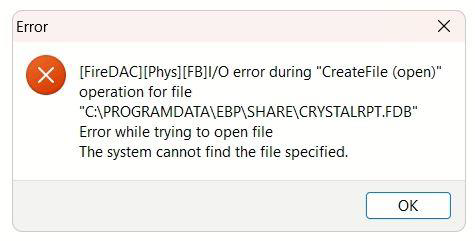 1. ตรวจสอบตำแหน่งที่เก็บไฟล์ CrystalRpt.fdb โดยเข้าไปตามตำแหน่งที่โปรแกรมแจ้งเตือน ตัวอย่างคือไปที่ C:/ProgramData/EBP/Share