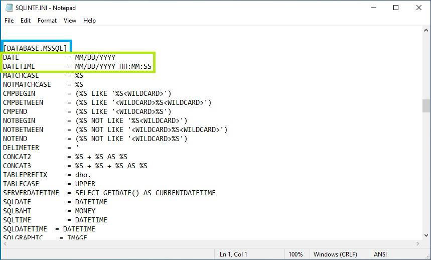 5. หน้าไฟล์ตั้งค่า SQLINTF.INI ให้เลื่อนหาหัวข้อ [DATABASE.MSSQL] จากนั้นสังเกตข้อมูล DATE ให้กำหนดค่ารูปแบบวันที่เป็น “MM/DD/YYYY” และข้อมูล DATETIME ให้กำหนดค่ารูปแบบวันที่และเวลาเป็น “MM/DD/YYYY HH:MM:SS” จากนั้นกดปุ่ม File เลือก “Save” เพื่อบันทึกข้อมูลที่ทำการเปลี่ยนแปลง