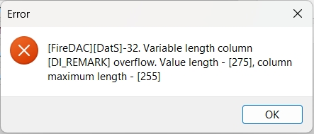 สาเหตุ: เกิดจากรายงานตามคำสั่ง SQL คอลัมน์ DI_REMARK VARCHAR(255) คือการแสดงผล 255 ตัวอักษร แต่หน้ารายงานมีการบันทึกรายละเอียดหรือหมายเหตุเป็นตัวอักษรความยาว 275 หรือความยาวเกินที่กำหนด ส่งผลให้เรียกรายงานแล้วไม่สามารถแสดงผลได้ เนื่องจาก DI_REMARK มีพื้นที่ไม่เพียงพอ ทำให้แสดง Error