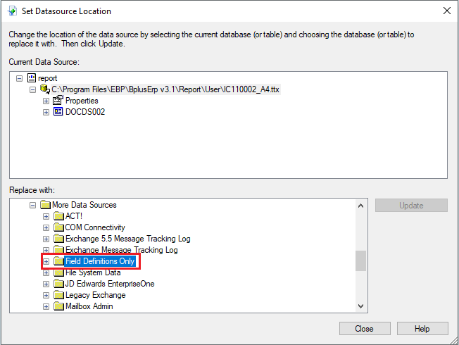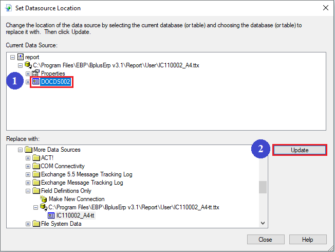 10. คลิกเลือกข้อมูลที่ต้องการอัปเดตด้านบนที่ช่อง Current Data Source จากนั้นคลิกปุ่ม Update เพื่อทำการยืนยันการ convert รายงาน เสร็จแล้วคลิกปุ่ม Close ตามลำดับ