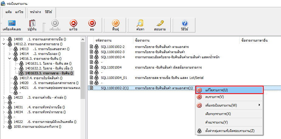 2. ไปที่เมนูรายงานที่ต้องการแก้ไข จากนั้นทำการคลิกขวาที่รายงานที่ต้องการแก้ไข > เลือก เมนูแก้ไขรายการ หรือดับเบิ้ลคลิกที่ชื่อรายงาน ดังภาพ
