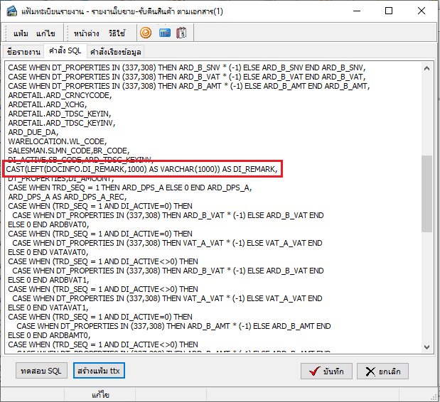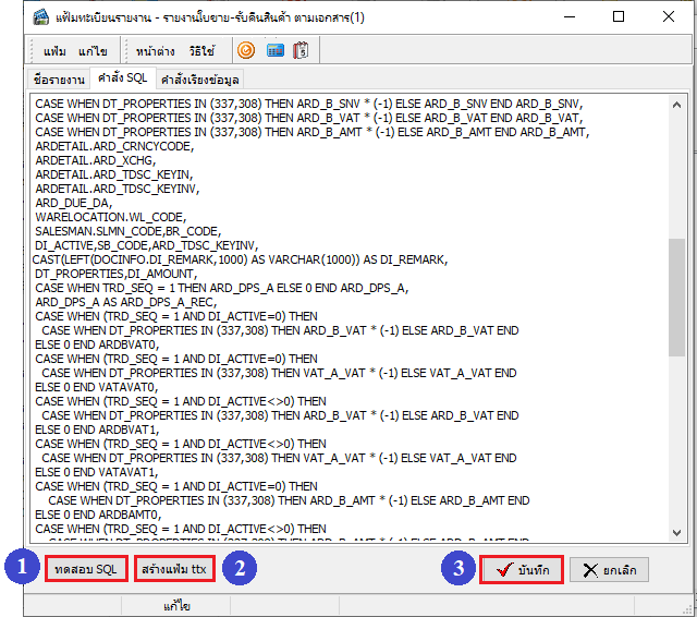 4. เมื่อทำการแก้ไขคำสั่ง SQL เรียบร้อยแล้ว ทำการทดสอบคำสั่ง โดยคลิกปุ่ม ทดสอบ SQL จากนั้นคลิกปุ่ม สร้างแฟ้ม ttx เพื่อทำการ convert รายงาน และคลิกปุ่ม บันทึก ตามลำดับ